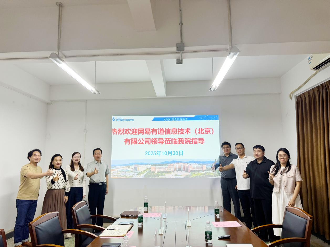 为深化产教融合、推动校企协同育人,10月30日,网易有道信息技术(北京)有限公司产教融合中心助理副总裁王辉,华南区区域总监叶朝阳,华南区区域经理欧阳艺驰一行莅临我校,就校企合作事宜开展专项调研并举行洽谈会。我院院长鲁岩,副院长王婧、朱丽芳,新媒体教研部部长李锦洪,校企合作专员谭嘉倩热情接待了王辉副总裁一行,双方围绕合作模式创新、人才培养、资源共享等议题展开深入交流。